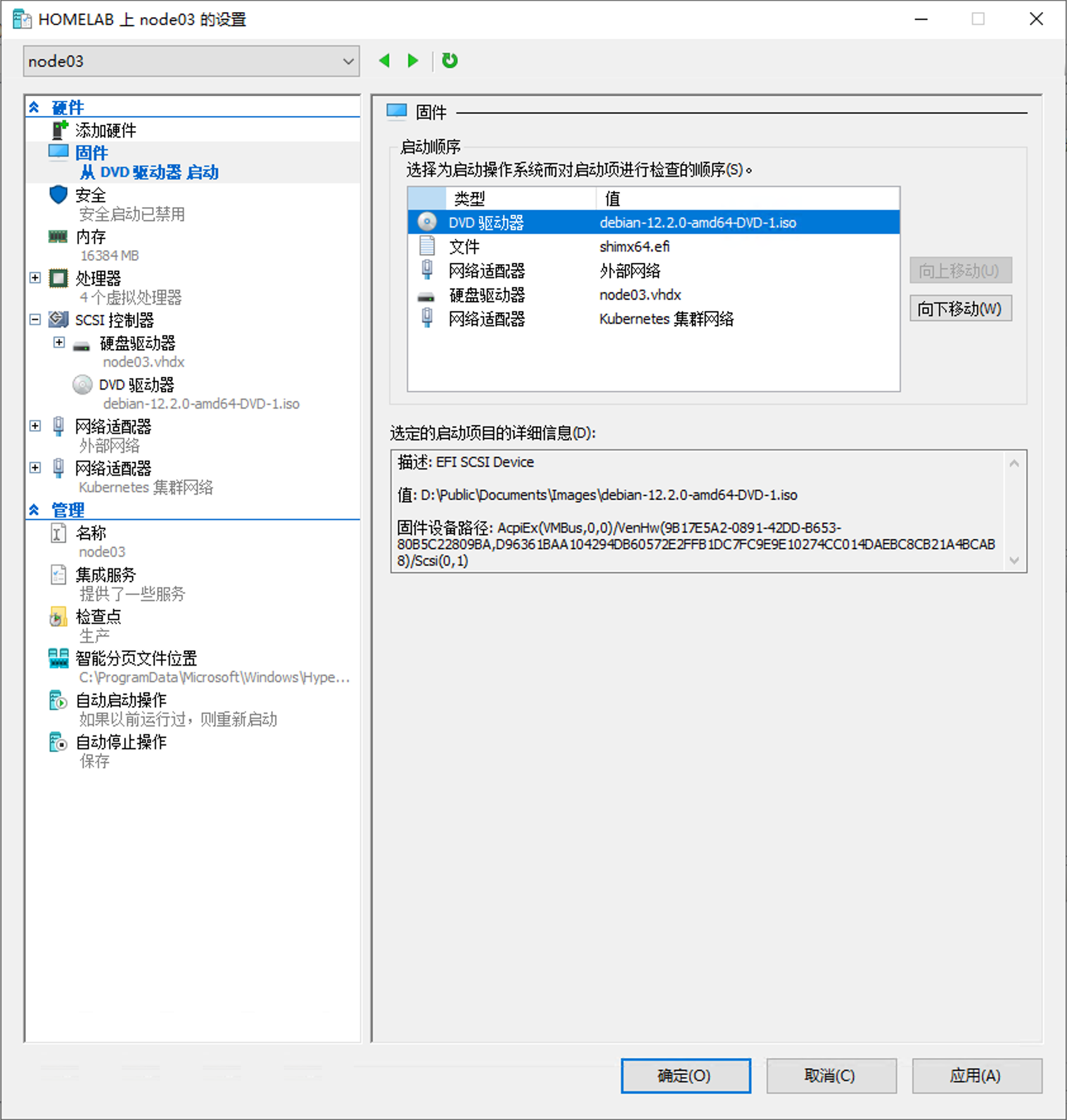iso文件。 - 在 Hyper-V 虚拟机设置的左侧面板中,选定「固件」来配置 BIOS 引导顺序。将 LiveCD 置于最优先的位置。
