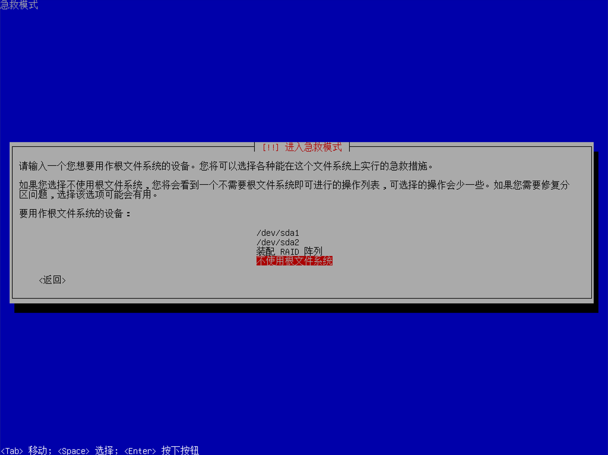 接下来,因为我们需要对硬盘进行配置,因此我们不希望使用任何的根文件系统,选择「不使用根文件系统」即可: