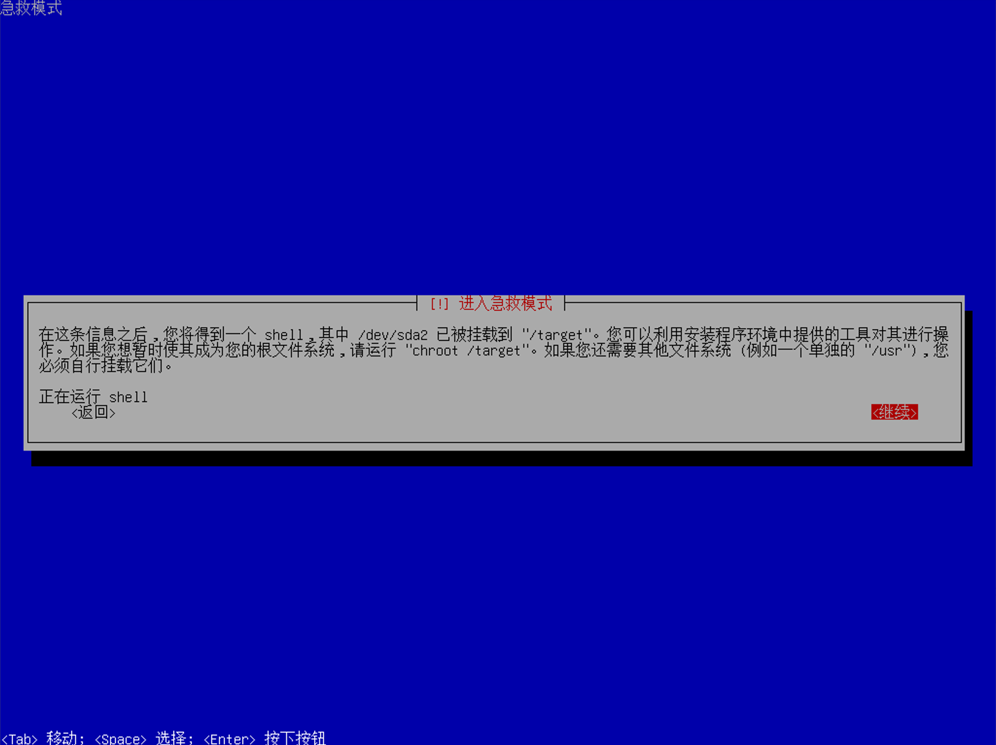 一般而言,挂载硬盘设备之后,可以选择将目标硬盘挂载为 /target 目录,然后依然使用 LiveCD 中的内核和环境去进行操作 /target 目录中的文件,这样就不用担心会出现完全没有救援措施的情况了。