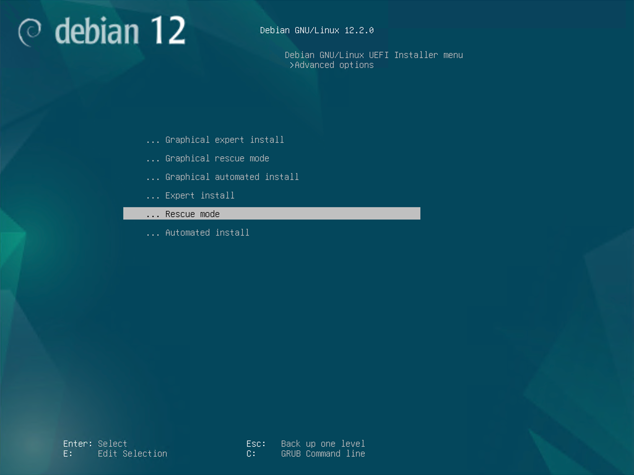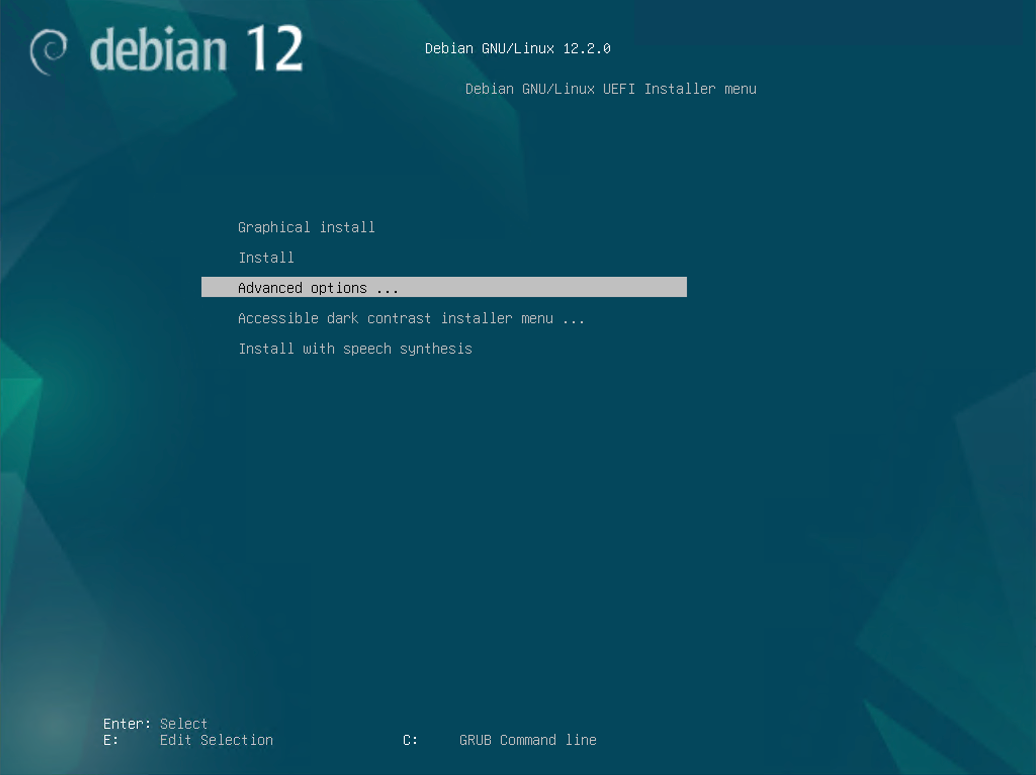由于我们不进行安装操作,此处通过 上 和 下 导航直接前往「Advanced options...(高级选项...)」菜单中,然后用 Enter 或者 回车 键,或者 右 进行「确认」操作: