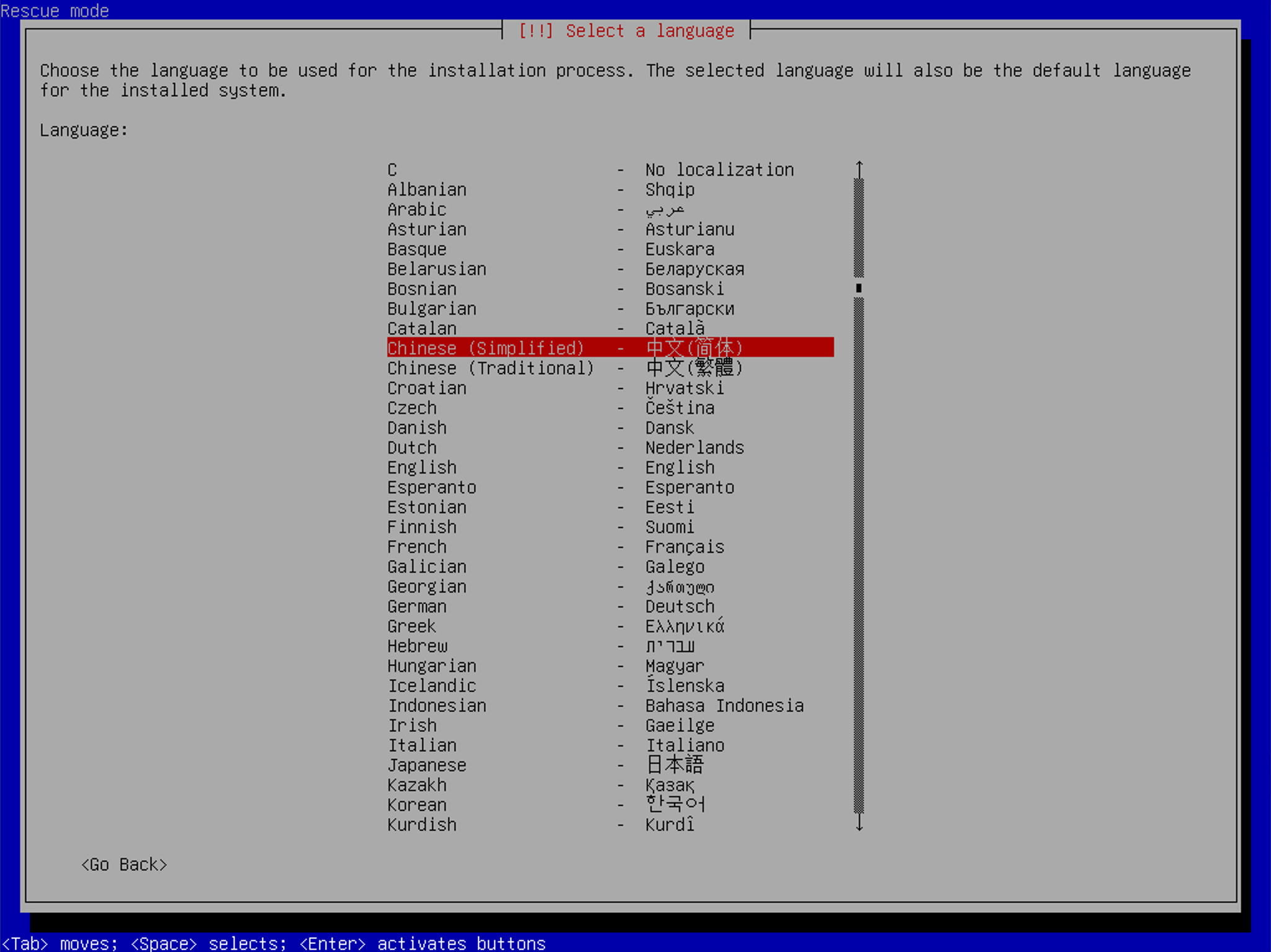 和以往安装操作系统一样,我们需要配置一下语言,地区,时区,因为我居住在上海,这里需要选择「Chinese (Simplified) - 中文(简体)」才可以配置中国时区,所以通过 上 和 下 导航选择「Chinese (Simplified) - 中文(简体)」用 Enter 或者 回车 键进行「确认」操作。