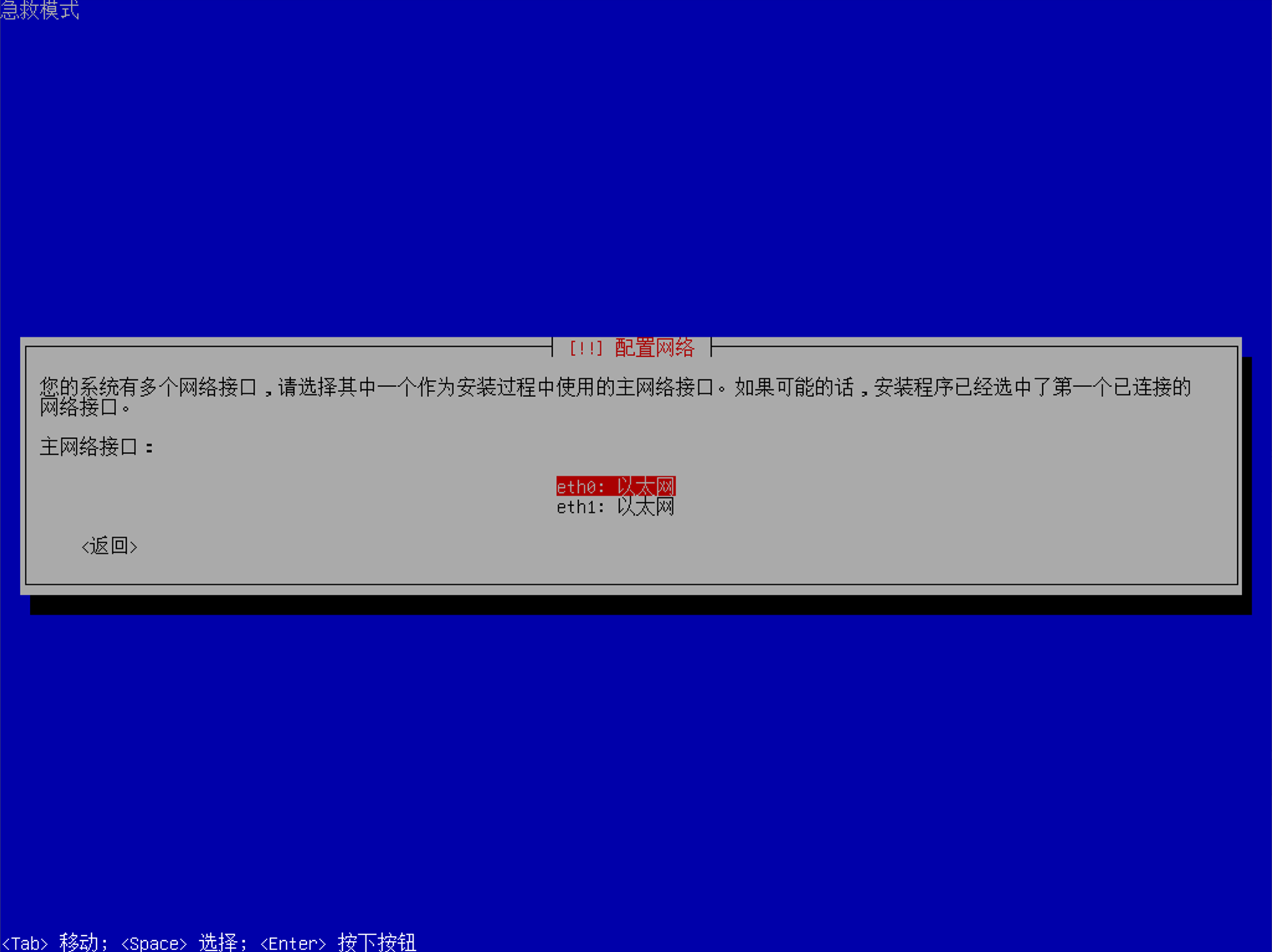 我在 Hyper-V 中给这台设备配置了两个网卡,所以这里会出现额外的网络配置选项,可以选择有网络的接口作为主要的接口,这里我选择 eth0: