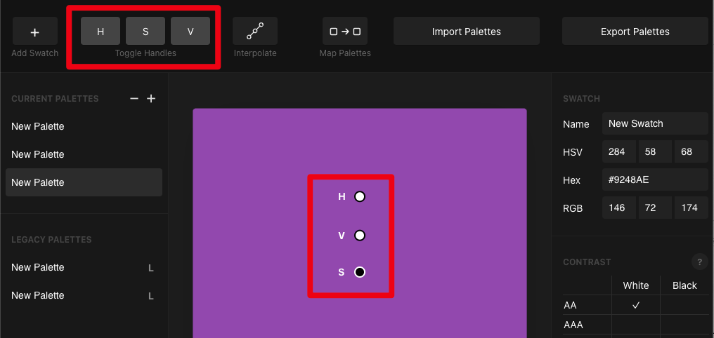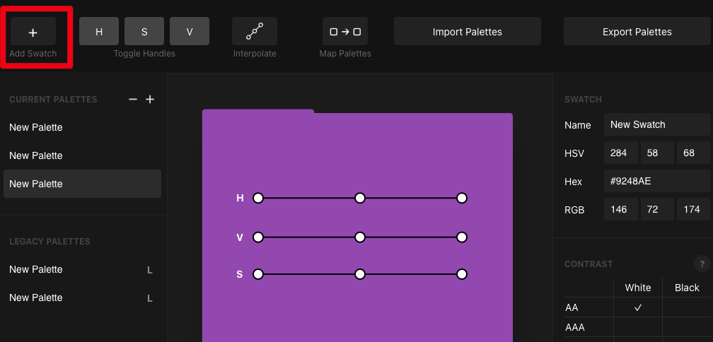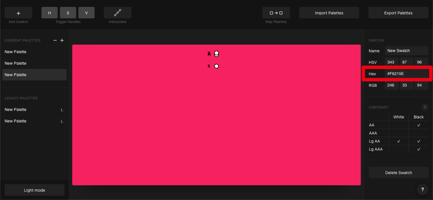 在 Palettte App 中选择中间色之后点两次 Add Swatch 按钮,然后拖动 H|V|S 三个滑块调整。从与基本颜色色调相匹配的颜色开始,并调整饱和度和亮度,直到您满意为止。