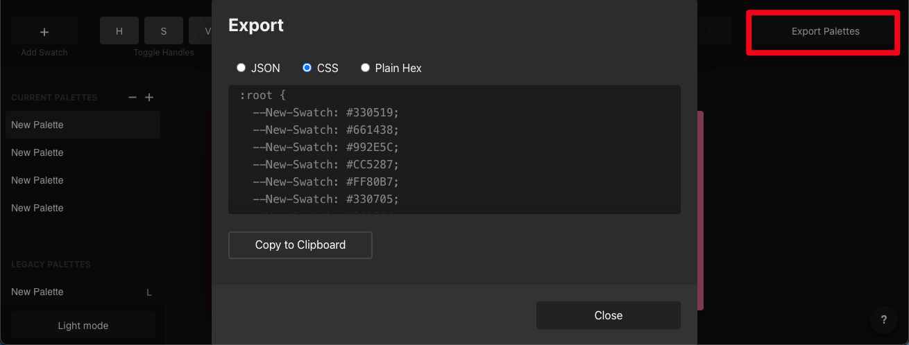 完成后点击 “Export Palettes” 导出结果。你可以通过 CSS 变量,Tailwind CSS、UnoCSS 或者 Figma 把它们应用到你的项目中。