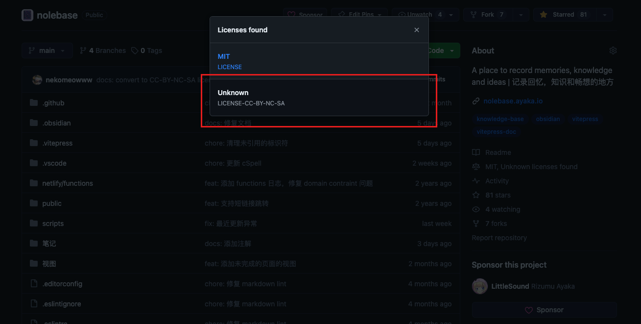 其实一直以来如果直接前往 nolebase/nolebase 的仓库的话,可以看到右侧的开源协议是会提示 Unknown 的: