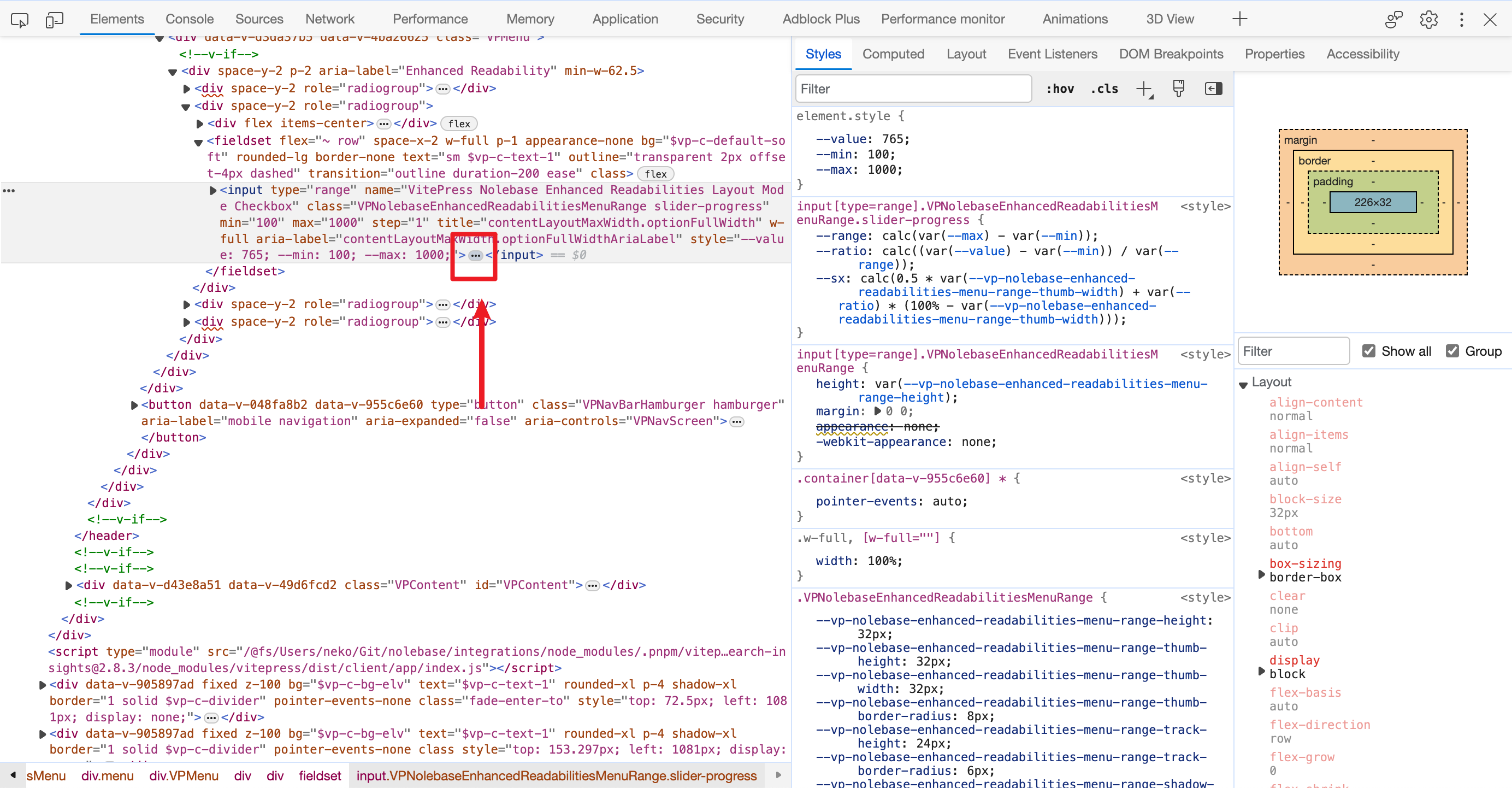 比如我这里正在调试一个 <input type="range" />(也就是范围输入元素(范围选择器)),可以观察到这个原本没有包含任何子元素的 <input> 元素突然多出来了可以展开的按钮,单击这个展开按钮就可以查看现在 <input> 元素附属的 track(范围输入滑块轨道)元素和 thumb(范围输入滑块)元素和他们的样式了: