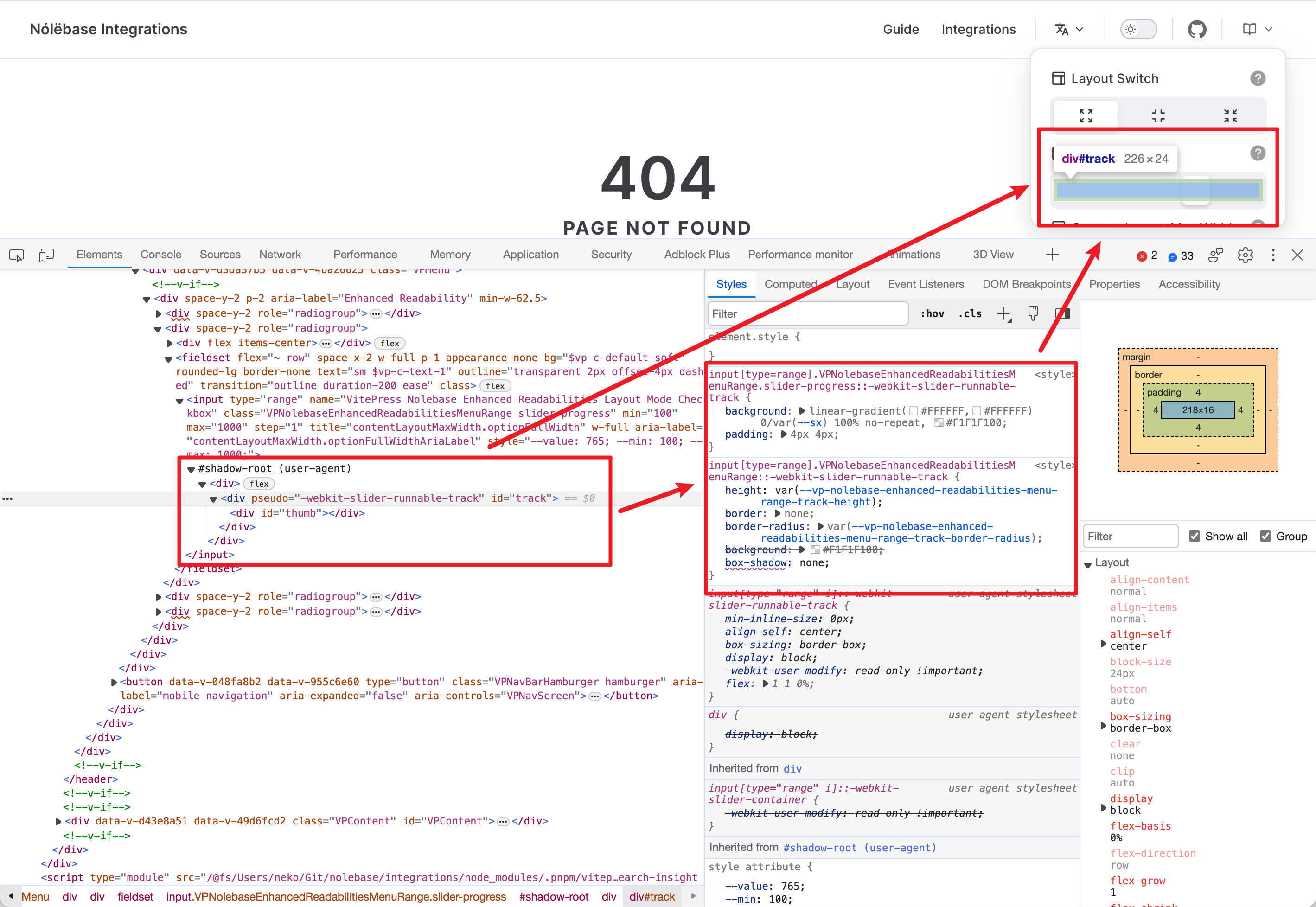 现在在展开的 <input> 元素下方,就可以看到名为 #shadow-root (user-agent)(也就是先前配置的所谓「用户代理阴影 DOM」,或者说「User agent shadow DOM」)的元素,再次将鼠标移动到 #shadow-root (user-agent) 之后,就可以看到我们正在调试的滑块轨道和滑块元素都被高亮了,右侧也出现了先前无法在「样式 Styles」标签页中的 ::webkit-slider-runnable-track 和 ::webkkit-slider-thumb 伪元素: