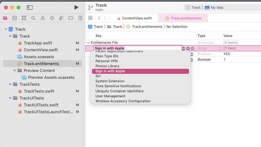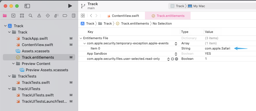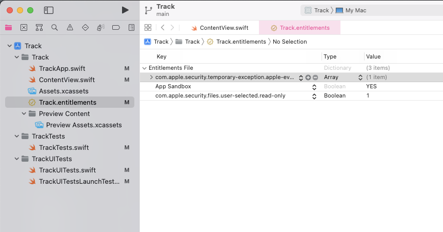</array>在 <项目名称>.entitlements 文件中添加字段 com.apple.security.temporary-exception.apple-events,Type(类型)设定为 Array(数组):