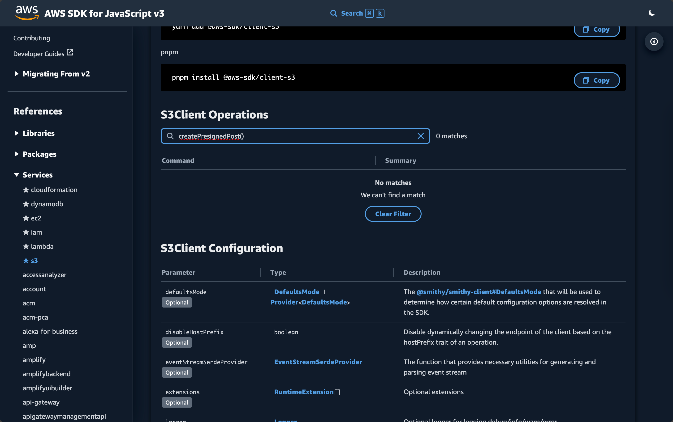 链接才能抵达现在最新版本的 JavaScript SDK 所在的文档,这个时候去搜索 createPresignedPost() 还是能发现其实没办法找到对应的函数的说明文档: