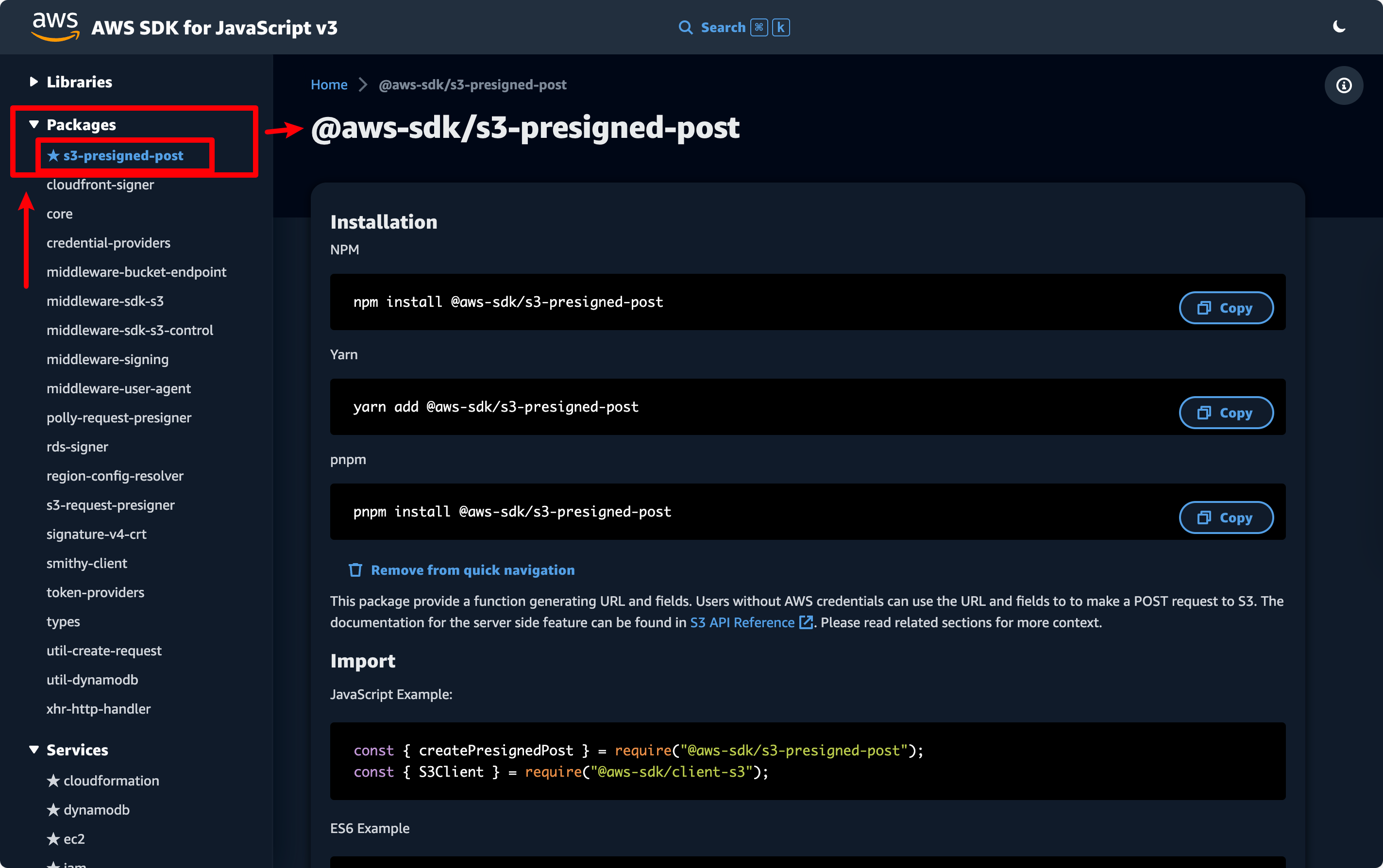 这是因为其实 S3 的 createPresignedPost() 函数是在单独的一个 Packages 的分类下面的,只有点击到了 Packages 下面的 s3-presigned-post 才能抵达真正的有关 Presigned Post 相关的文档:
