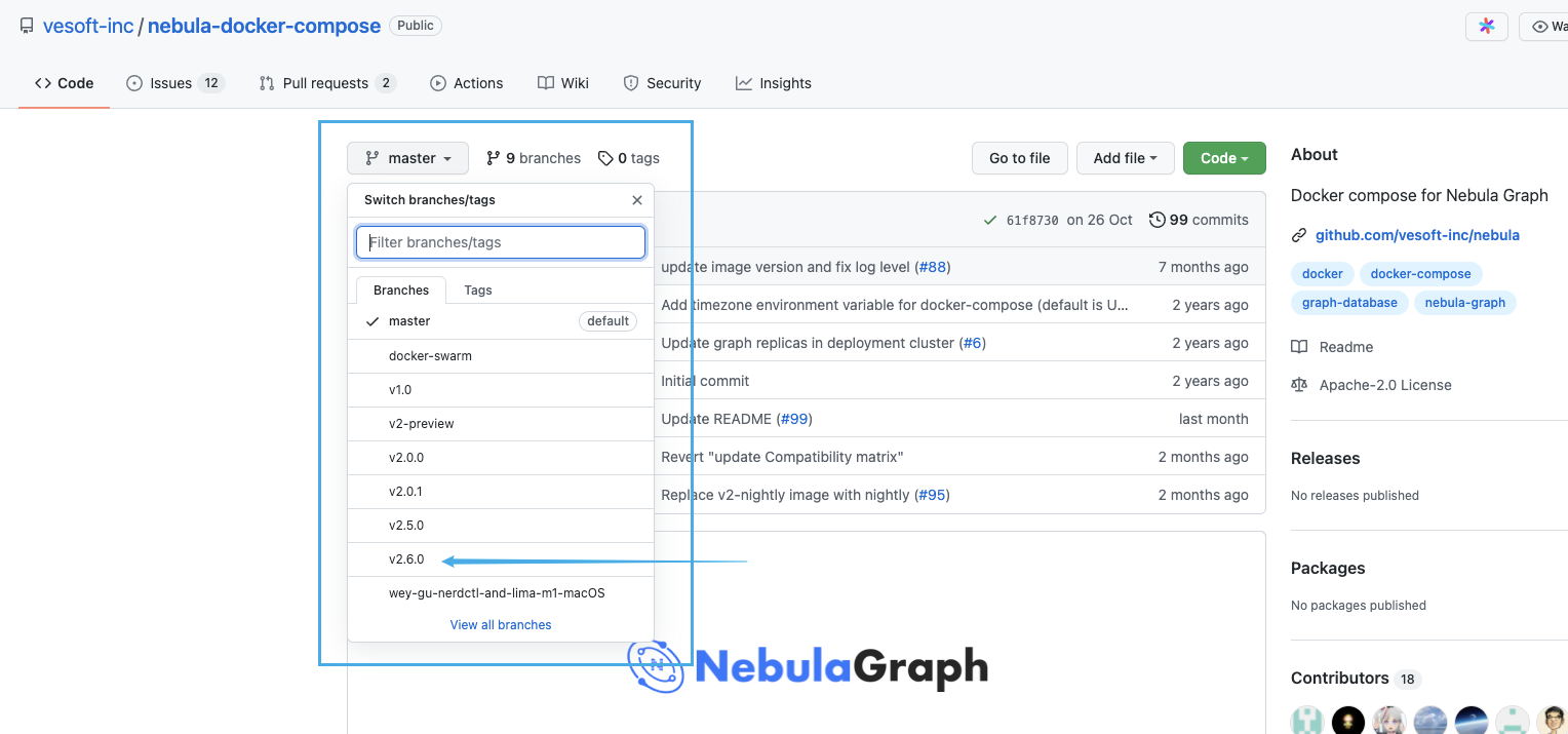 在官方仓库上查看当前最新的和最推荐的版本,此处写下文档时,最新版本是 2.6.0(对应的分支应该是 v2.6.0),我们切换到 2.6.0 分支