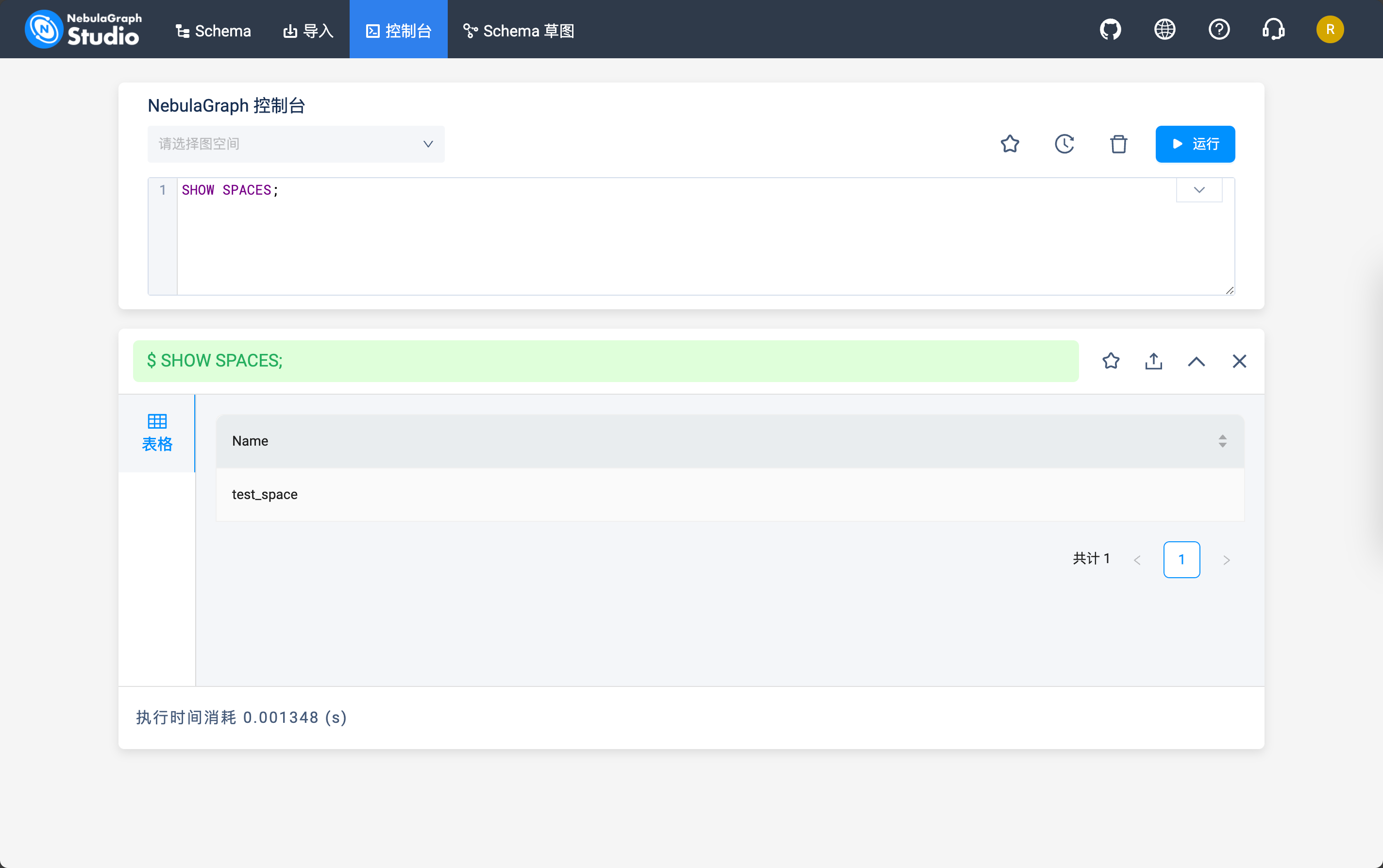 然后到「控制台」标签页就可以通过下面的命令查看当前的 NebulaGraph 中存储的图空间了: