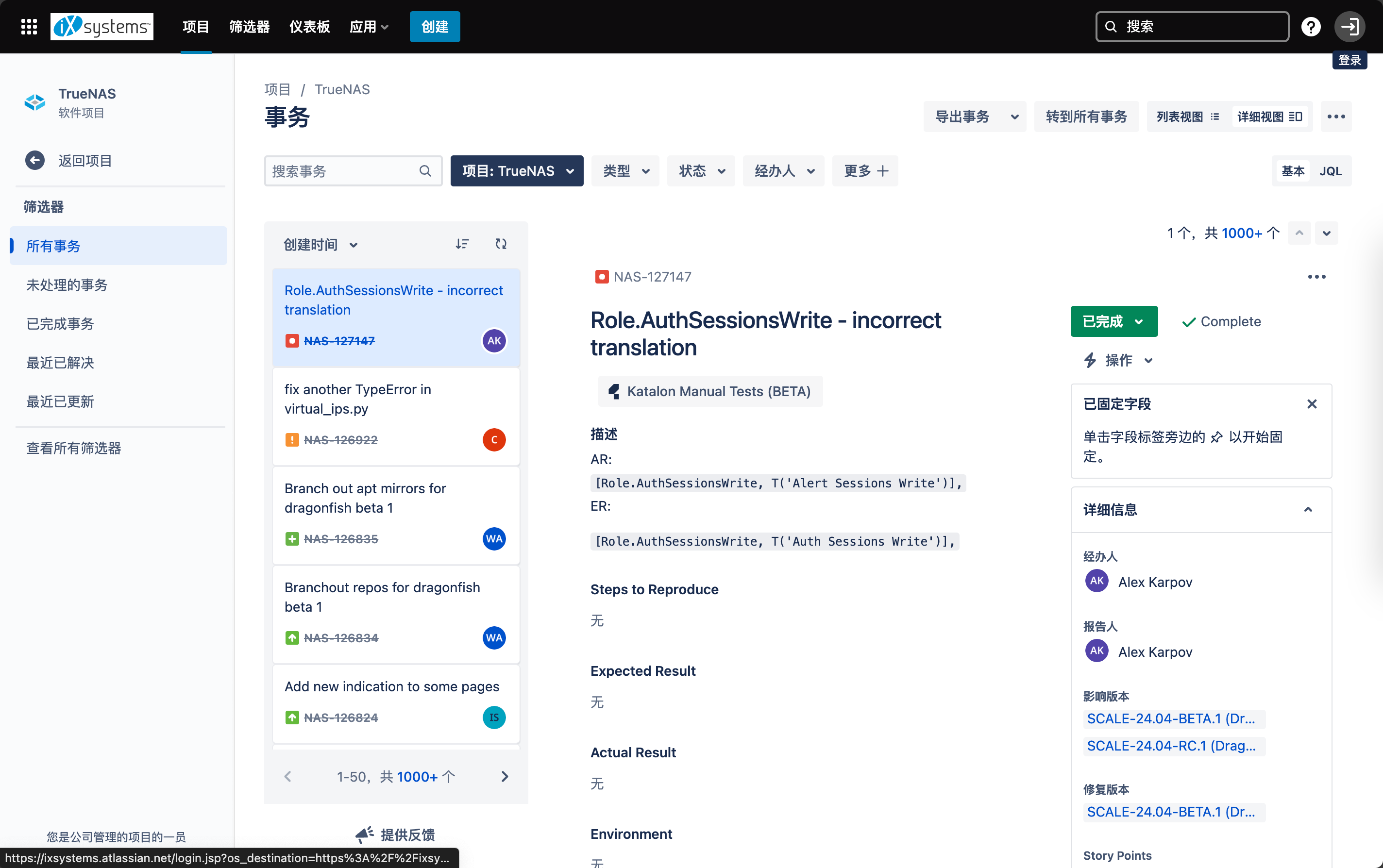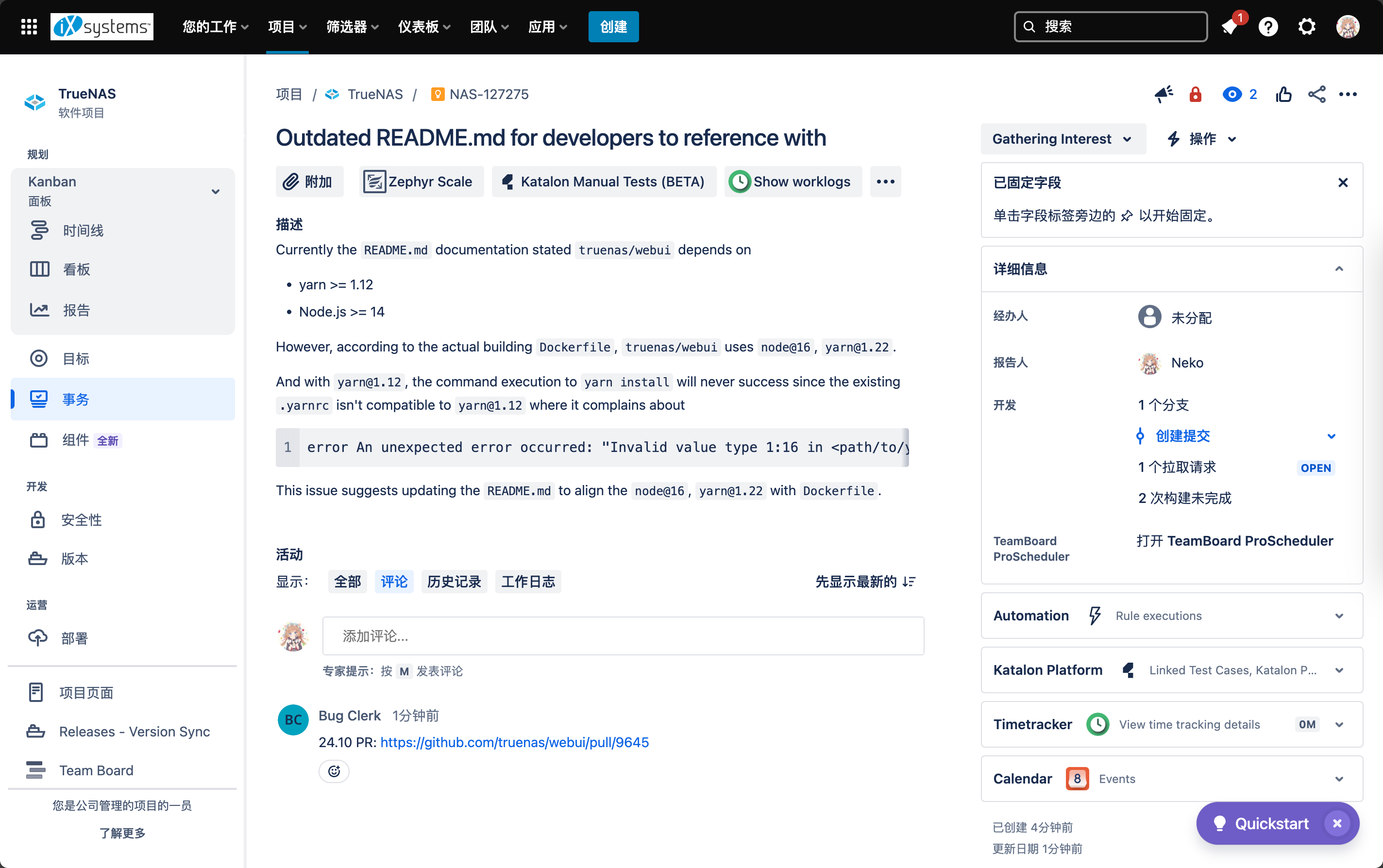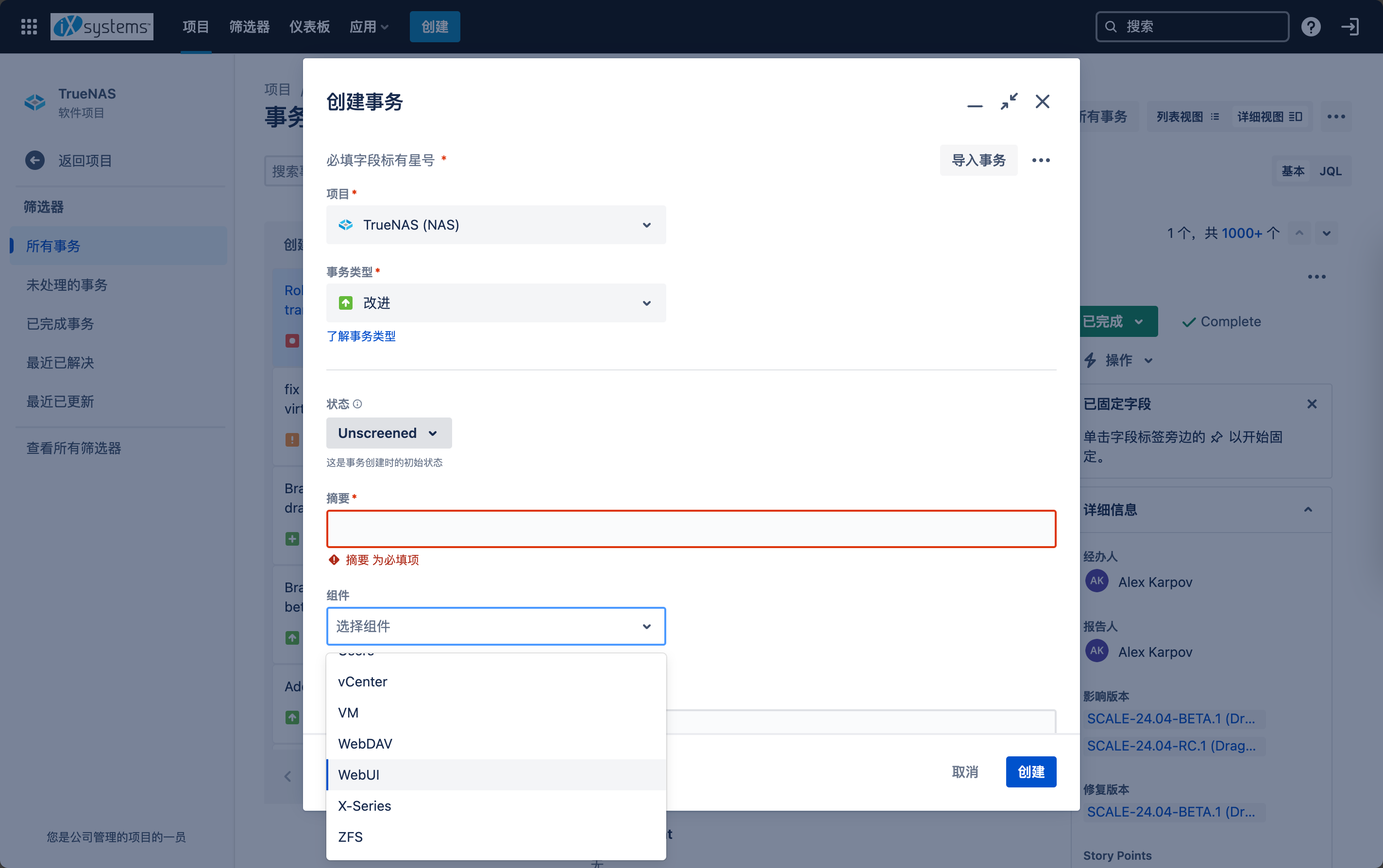 - 和其他的 GitHub 上协作的开源项目不同,TrueNAS 使用 Atlassian 公司开发的 Jira 平台追踪和记录 Issue(Bug 提交,需求说明),所以我们需要先到 Jira 上像开 Issue 那样开一个单独的 Issue 来记录并且发到 Jira 上