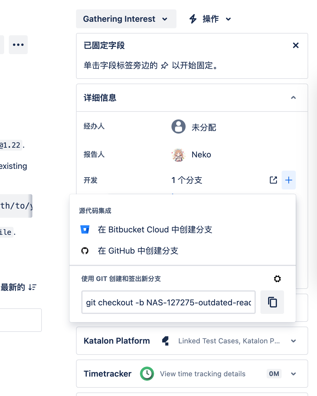 创建 Jira 之后,为了方便 TrueNAS 的 CI/CD Bot 自动识别我们的 Jira 事务 ID,可以通过 Jira 面板复制一个 Jira 提供的分支名称进行开发: