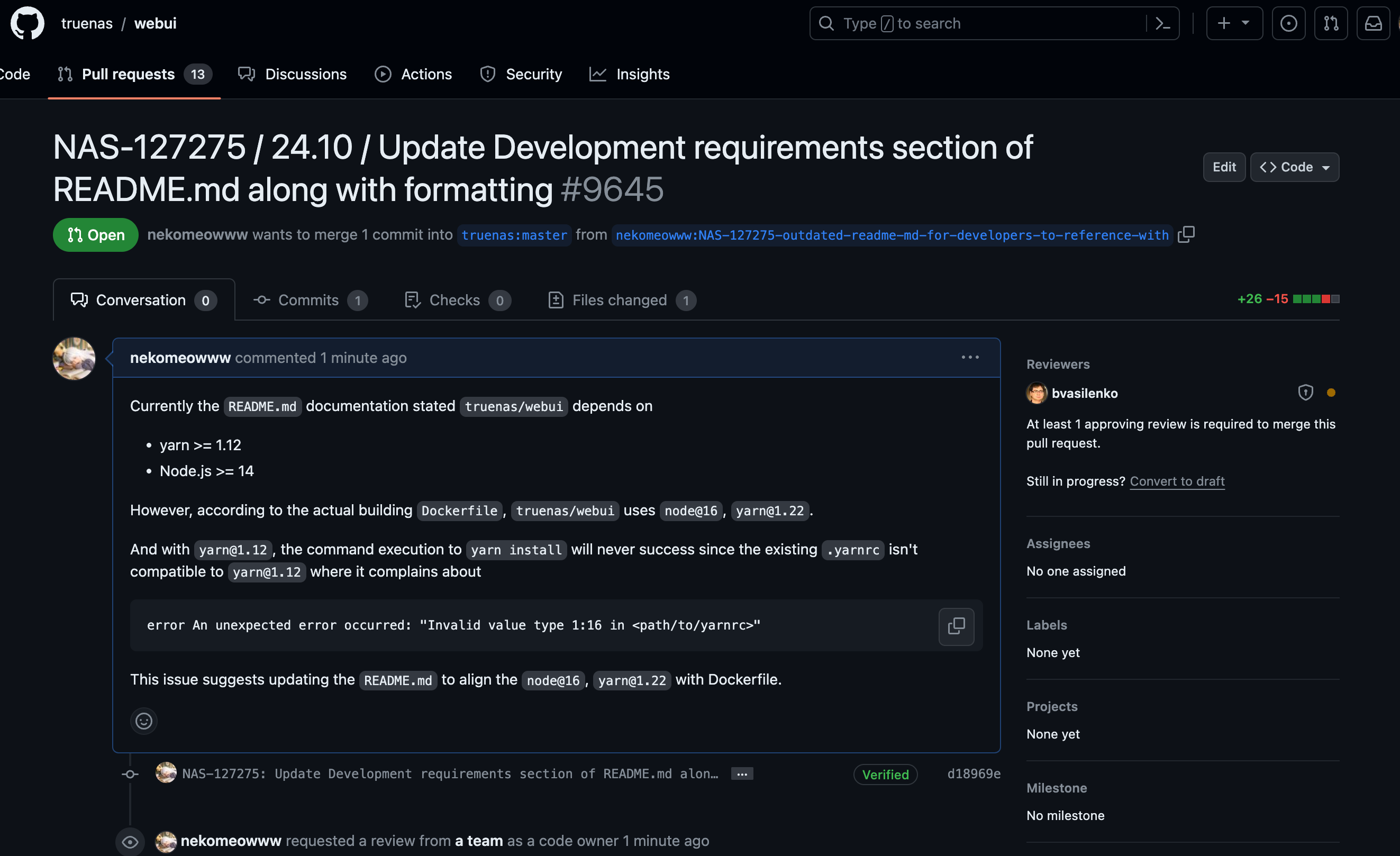 - NAS-127275: Update Development requirements section of README.md along with formatting by nekomeowww · Pull Request #9645 · truenas/webui,Jira 在 https://ixsystems.atlassian.net/browse/NAS-127275