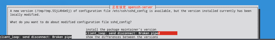 我之前在滚更新的时候离开了电脑,结果更新的途中弹窗提示并且 hold 住了整个更新,结果跑 SSH 连接去更新的设备和远端服务器的连接故障了,发生了 Broken Pipe,而且我还没有开 tmux 和 screen 去维持住 tty。
