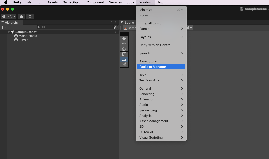 要在 macOS 上检查 Package Manager 的设定,需要前往左上角「Window」-「Package Manager」来打开 Package Manager: