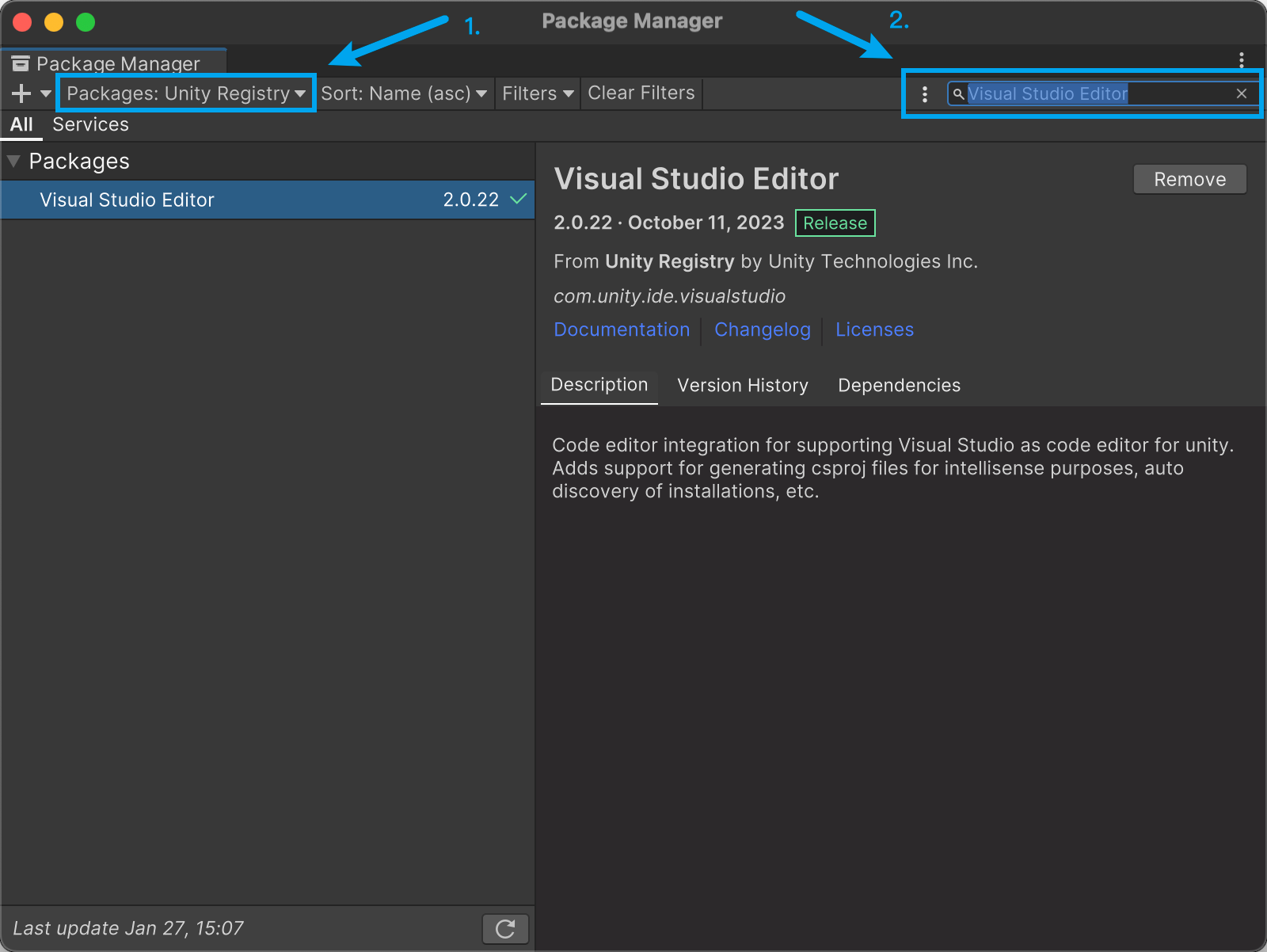 我们需要在 Unity 的 Package Manager 中确认 Visual Studio Editor 的 Unity 插件包是激活状态。