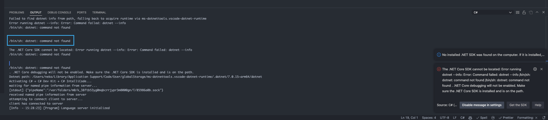 出现这样的报错的时候如果我们观察在 VSCode 中的 C# 的 Output(输出)的时候可以发现是因为通过 /bin/sh 运行 dotnet 的时候出现了问题: