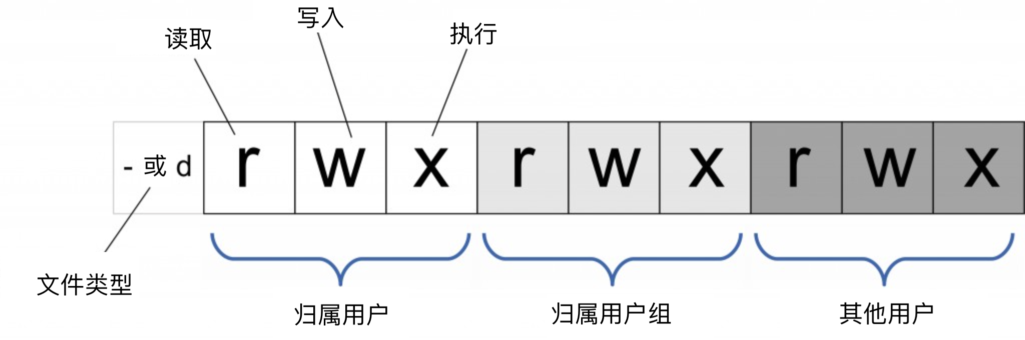 Linux/Unix 的文件调用权限分为三级 : 文件所有者(Owner)、用户组(Group)、其它用户(Other Users)。具体参考:Linux 权限