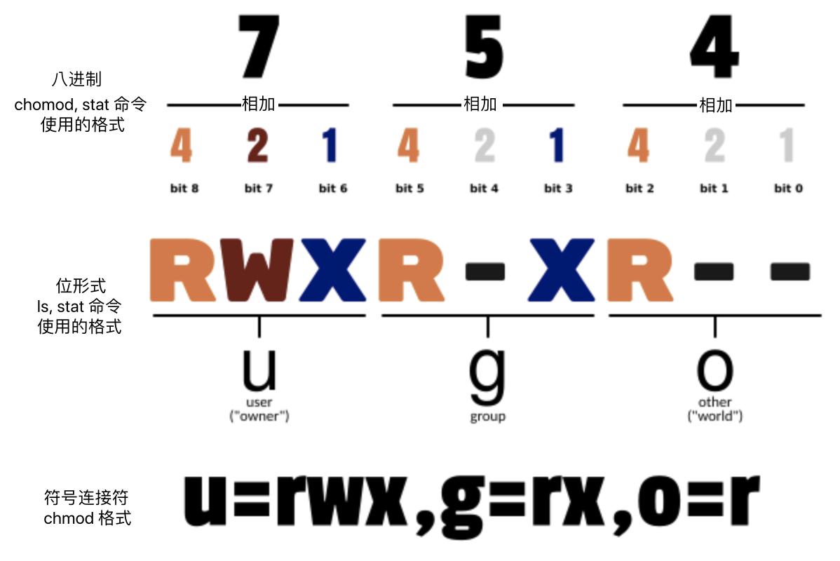 只有文件所有者和超级用户可以修改文件或目录的权限。可以使用绝对模式(八进制数字模式),符号模式指定文件的权限。