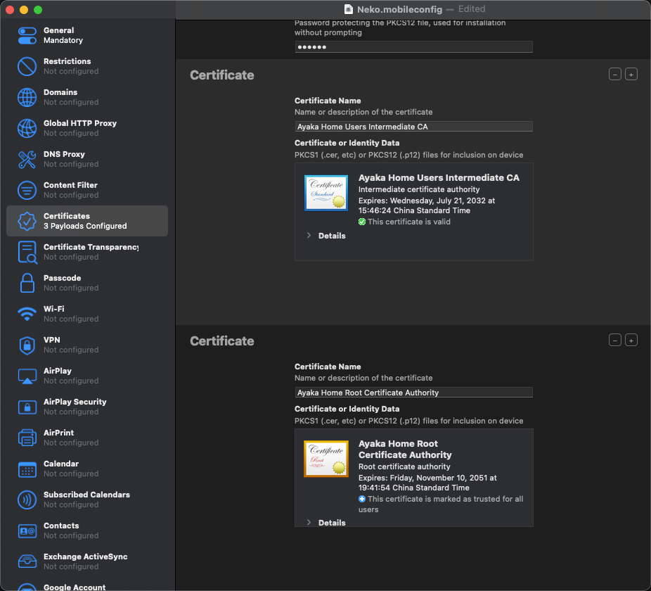 openssl pkcs12 -export -in clients/neko/2024/client.crt -inkey clients/neko/2024/client.pem -certfile intermediates/legacy/home_ca_intermediate_1_bundle.crt -out clients/neko/2024/client.p12 -legacy成功导入到 KeyStore 里面之后记得删除私钥和证书签发请求文件