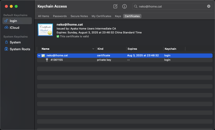 然后在弹出的「Keychain(钥匙串访问)」中点击「Login(登录)」分类,然后点选「Certificates(证书)」Tab,就可以看到了,如果之前有正确配置 CA 证书的话,可以看到小绿标: