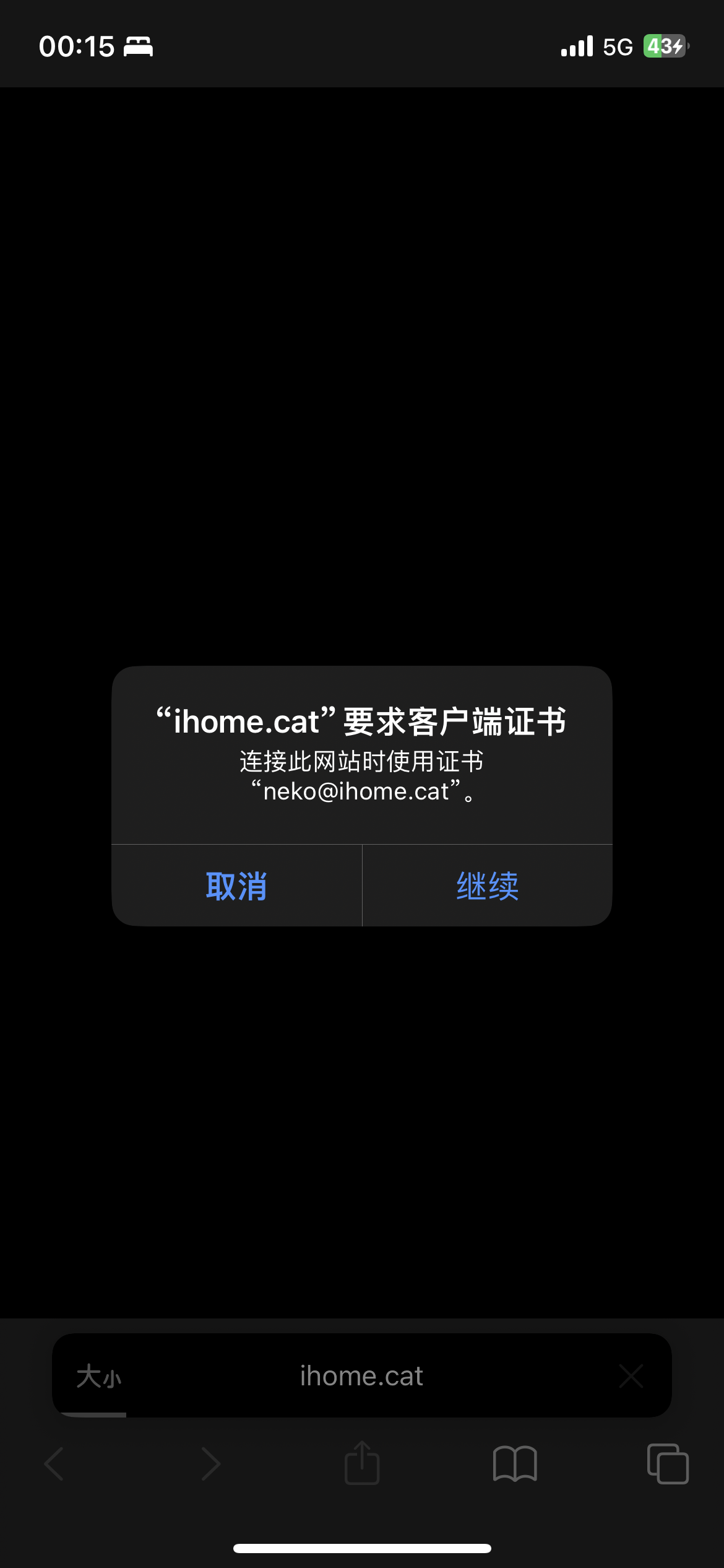 安装结束后,打开 Safari 浏览器,然后导航到需要 mTLS 客户端证书的网站,就会发现提示说需要使用客户端证书了: